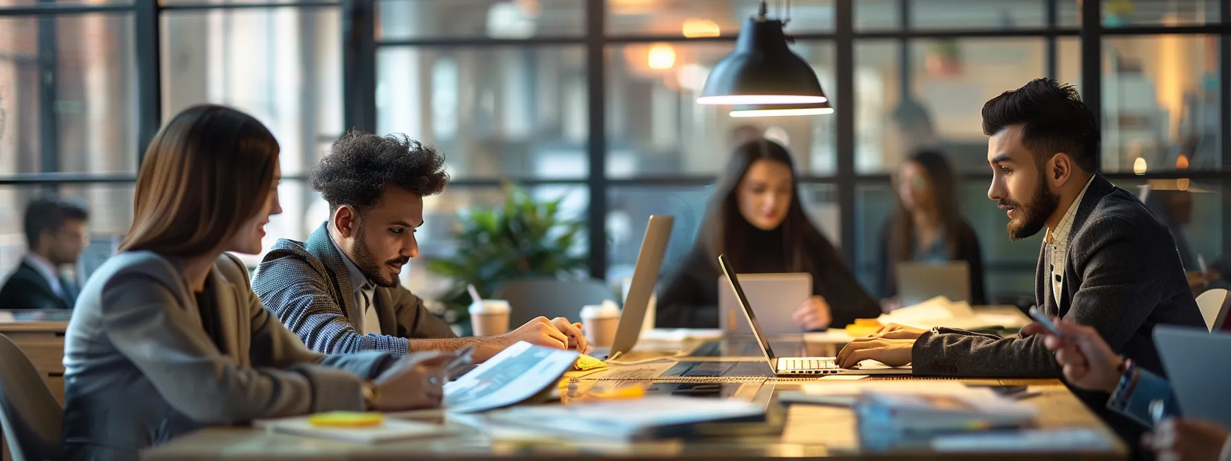a group of professionals sitting around a table, pointing to a chart showing cost savings with asap cheques.